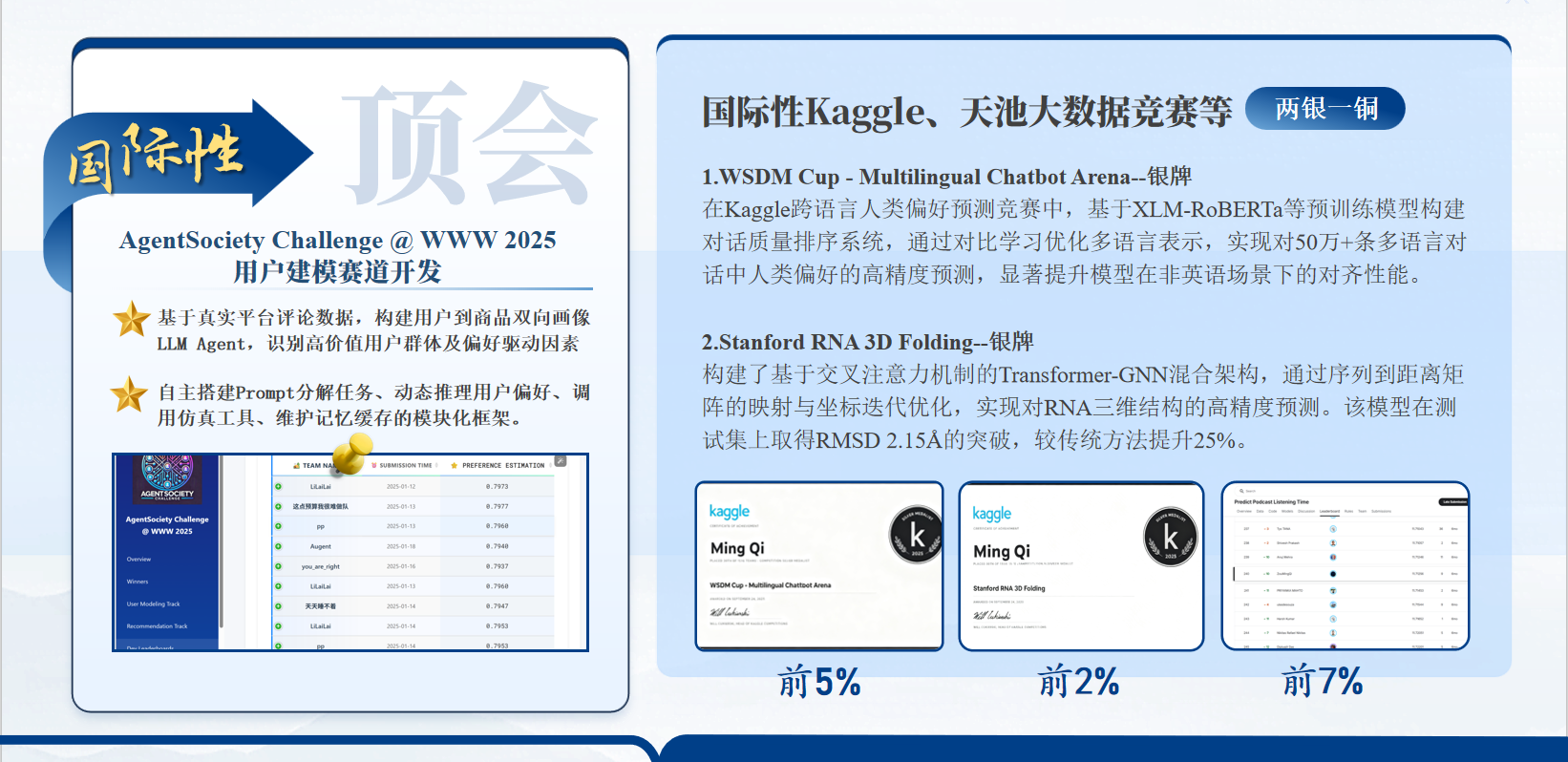 从大学开始接触编程,我逐渐被人工智能与大数据的魅力所吸引。在天津财经大学大数据管理与应用专业的学习中,我系统掌握了深度学习、算法与数据结构等核心课程,并在Kaggle竞赛中获得银牌两项、铜牌一项的成绩,这让我更加坚定了在AI领域深耕的决心。