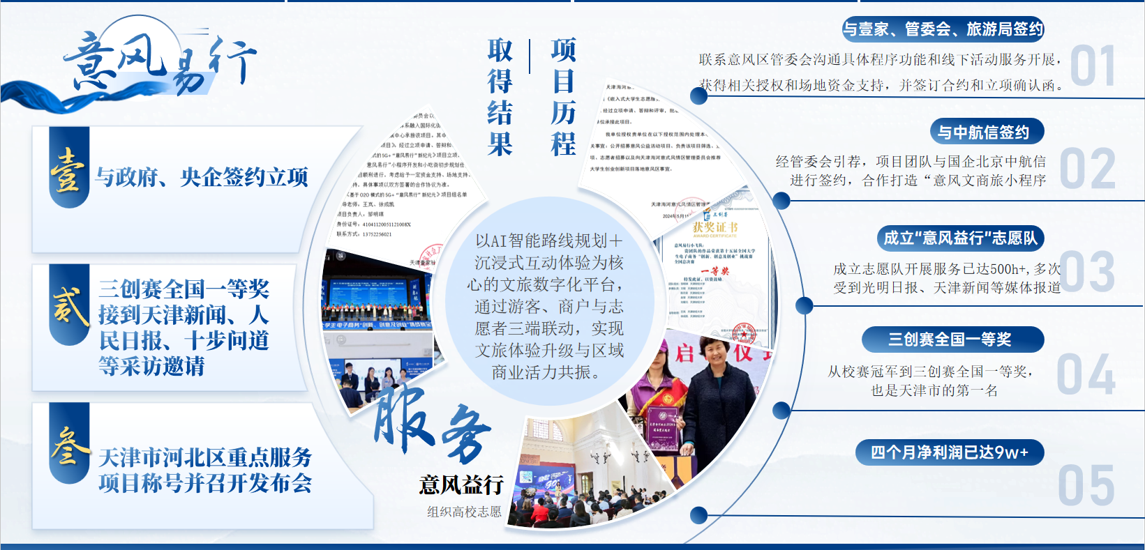 作为意风区文商旅平台的创始人,我从0到1完成了产品设计、开发与上线,项目获得天津市河北区重点发展项目认定,上线首日DAU突破8000+。同时,作为互联网技术协会会长,我带领100+人的技术社团,策划了10余场AI项目活动与技术分享会。